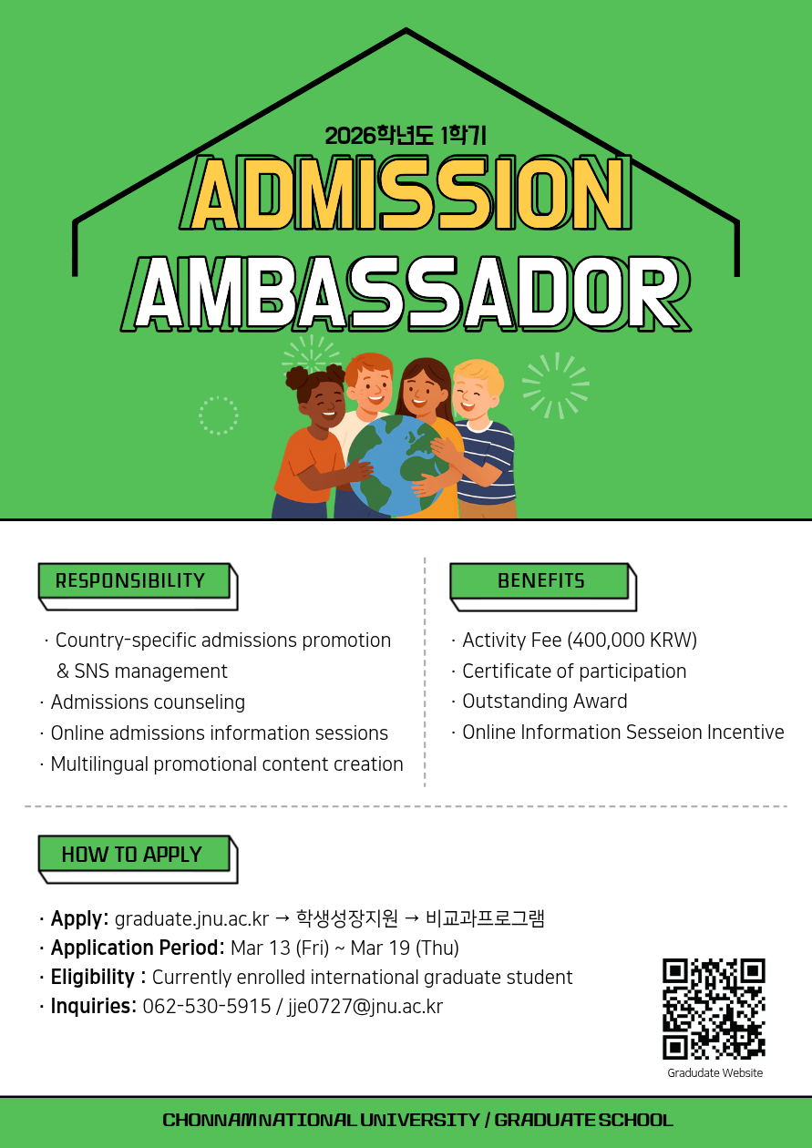 1. 우리 대학 홍보 강화를 통한 우수 외국인 대학원생 신입생 유치 등을 위하여 「2026학년도 1학기 외국인 대학원생 입학홍보대사」를 다음과 같이 선발합니다.